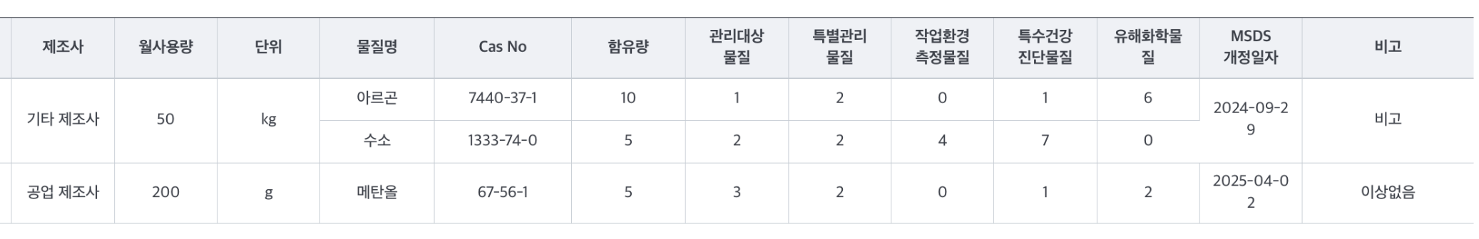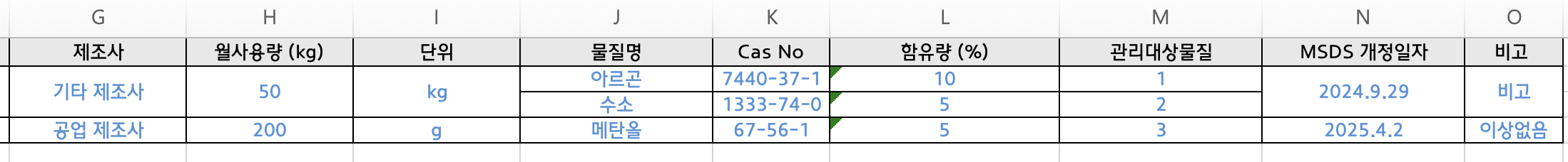 | 제조사 | 월사용량(kg) | 단위 | 물질명 | Cas No | 함유량(%) | 관리대상물질 | 개정일자 | 비고 |