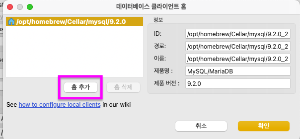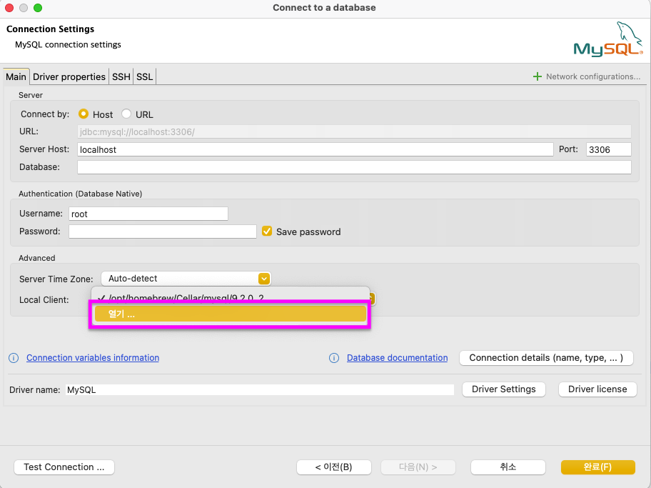 아까 homebrew로 깔았던 mysql이 존재하는 경로와 동일하게 선택해주시면 됩니다.