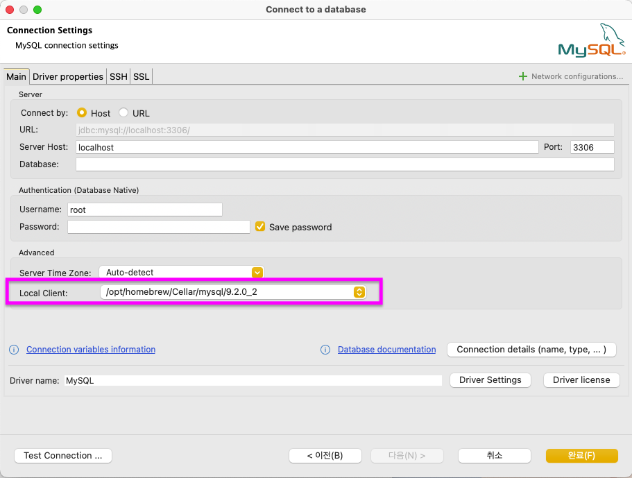 이때 Local Client 경로와 mysql 버전이 올바른지 확인해주시고 Test Connection을 진행해주세요!