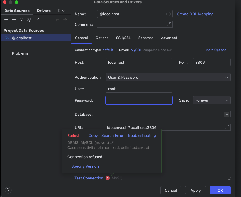 DataGrip 에서 연결 시도를 했을때, 아래 사진처럼 Failed가 떴습니다.
